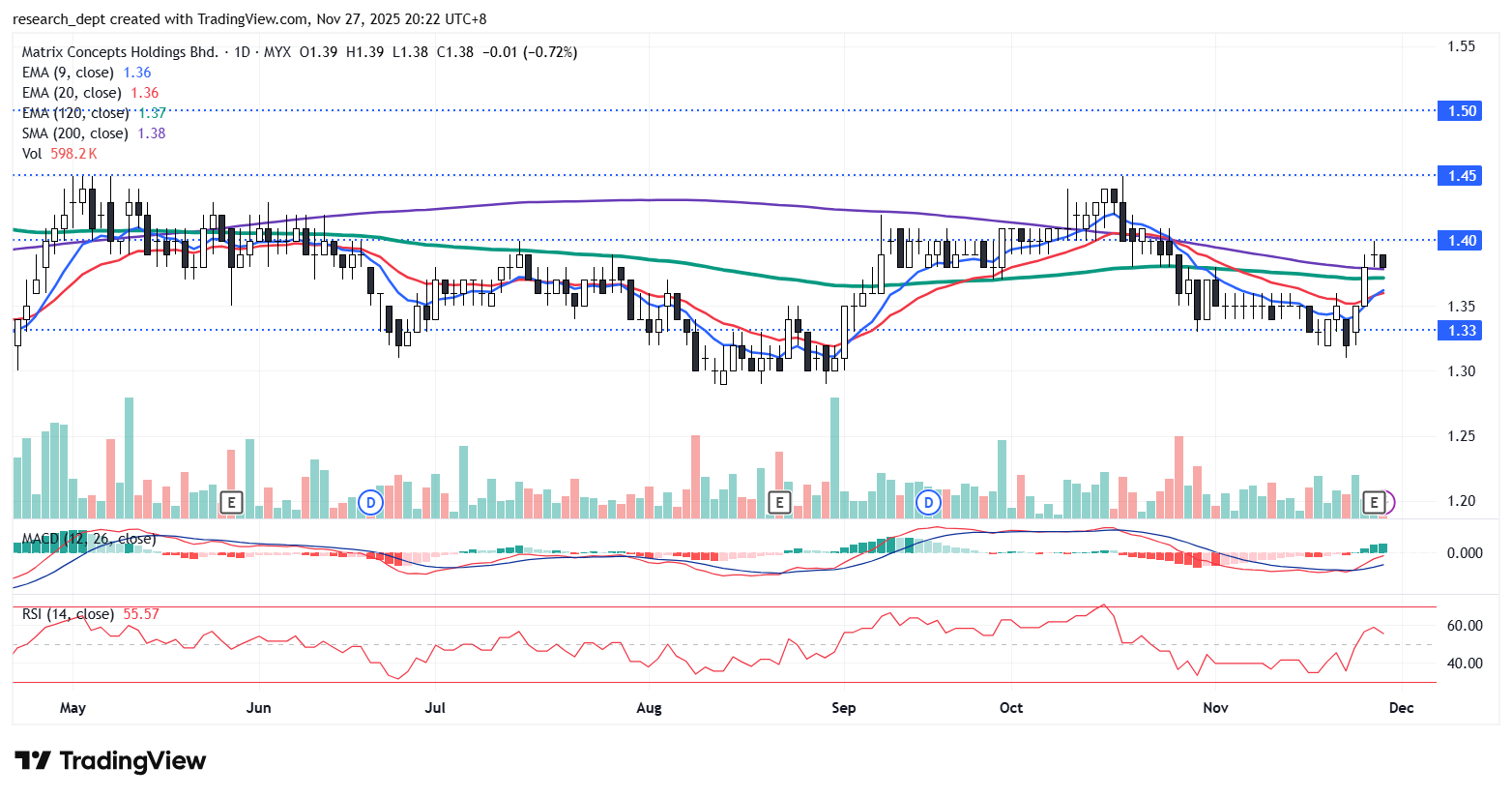 The stock has been oscillating within a broad sideways range between RM1.33 and RM1.45 for the past several months. After a brief dip toward RM1.33 in mid-November, it rebounded firmly and has since reclaimed the short-term EMAs. It is now attempting to retest the RM1.40 resistance level. A decisive close above RM1.40 would pave the way toward RM1.45 and RM1.50, while immediate support remains at RM1.33.