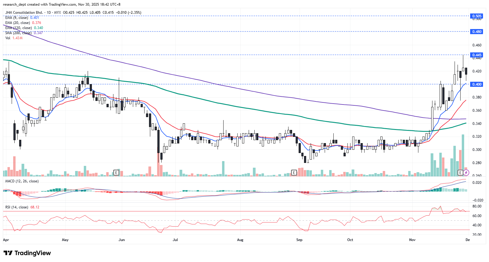 The counter has regained upward traction following a period of consolidation. Momentum indicators are turning constructive, with the RSI and MACD both hovering at bullish territory. Price is now hovering below the breakout level of RM0.445, where a decisive move above would confirm an uptrend continuation, paving the way toward the resistance levels at RM0.480 and RM0.505. On the downside, RM0.400 serves as immediate support.