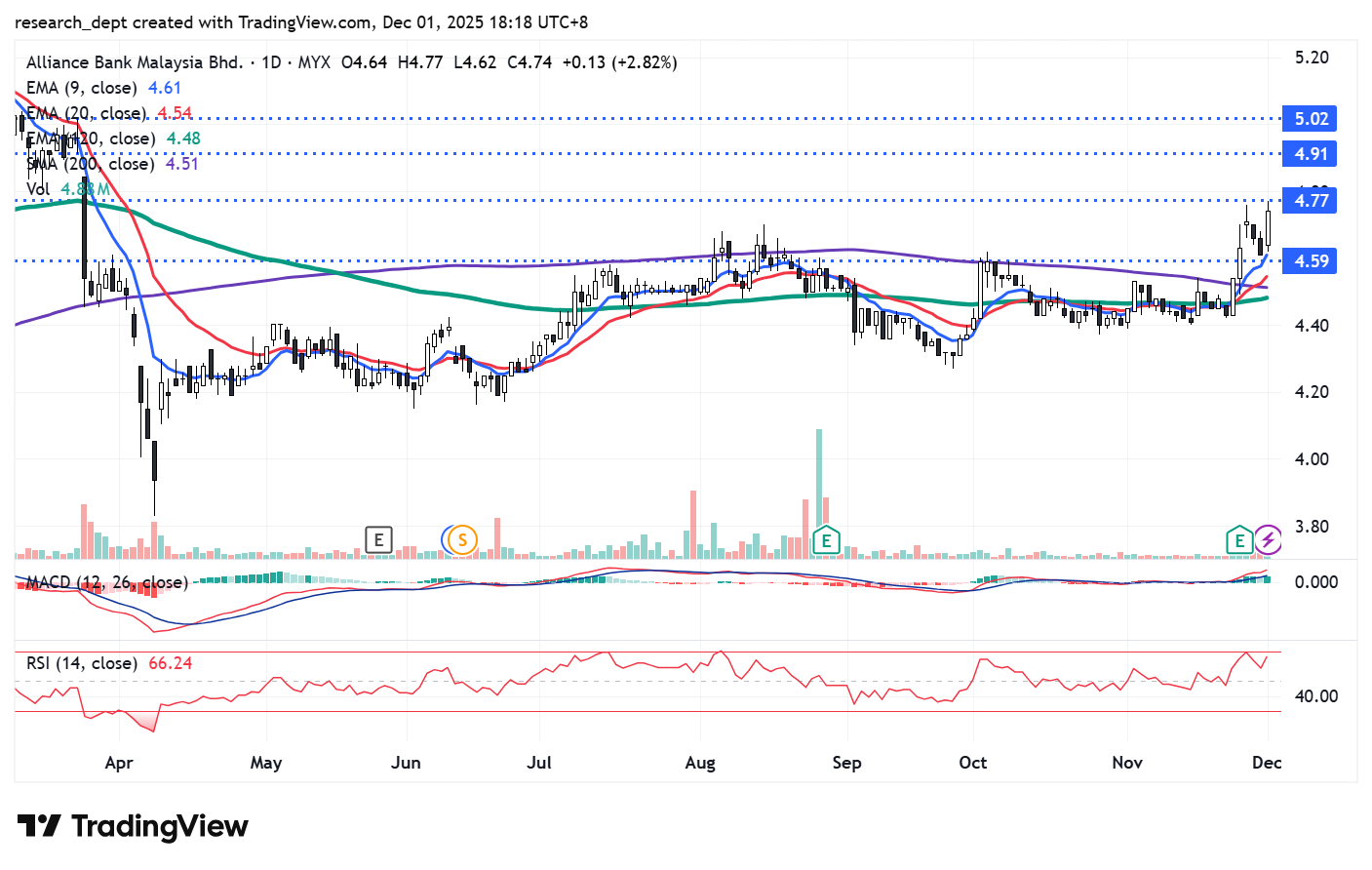 The counter maintains a constructive momentum, advancing toward the RM4.77 breakout threshold. Both the 9-day and 20-day EMAs continue to trend higher, reinforcing the bullish setup. A breakout above RM4.77 could accelerate upside toward RM4.91 and RM5.02 resistance zones, while RM4.59 serves as the near-term support.