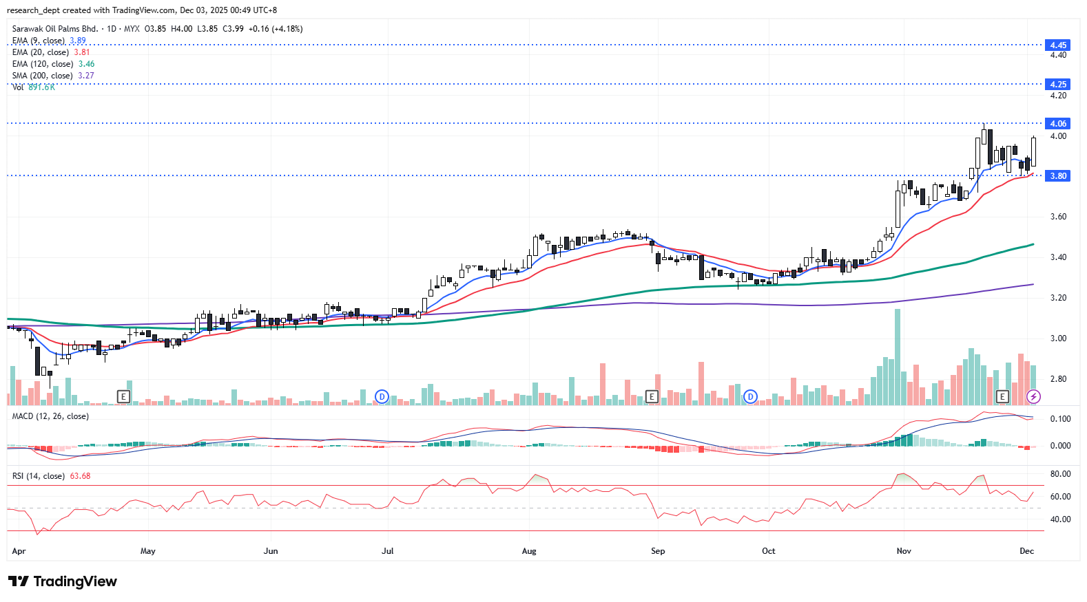 The stock is forming a constructive base, consolidating tightly above its 20-day moving average. Momentum indicators are turning positive, signalling a potential buildup of bullish momentum ahead of a breakout. A decisive move above RM4.06 would confirm the breakout, paving the way toward RM4.25 and RM4.45. Meanwhile, RM3.80 remains a key support level.