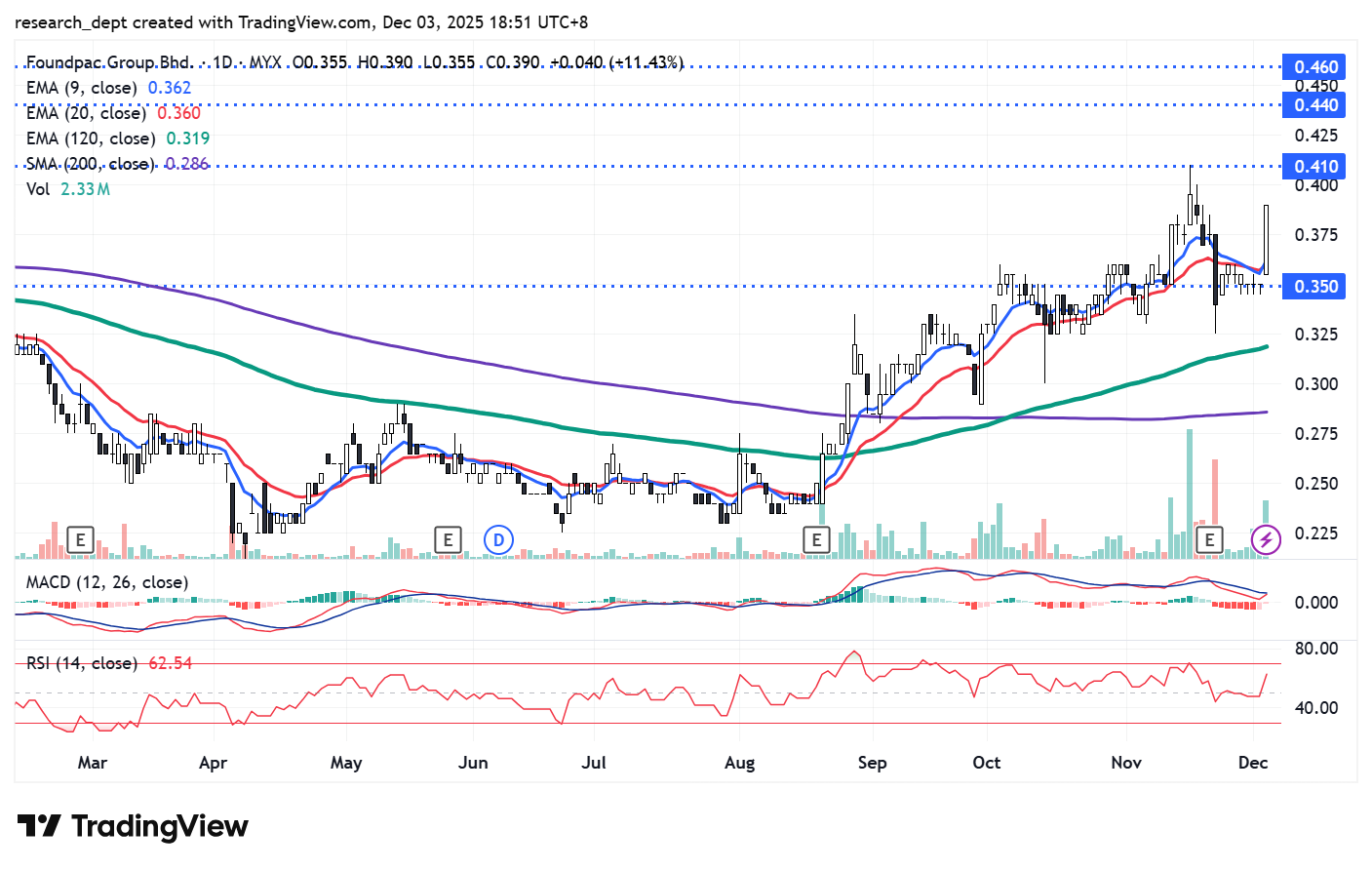 The stock has regained upward traction following a short period of consolidation. Momentum indicators are turning constructive, with the RSI approaching bullish territory and the MACD showing early signs of recovery. Price is now nearing the breakout level at RM0.41, where a breakout above would confirm an uptrend continuation, paving the way toward the resistance levels at RM0.44 and RM0.46. On the downside, RM0.35 serves as immediate support.