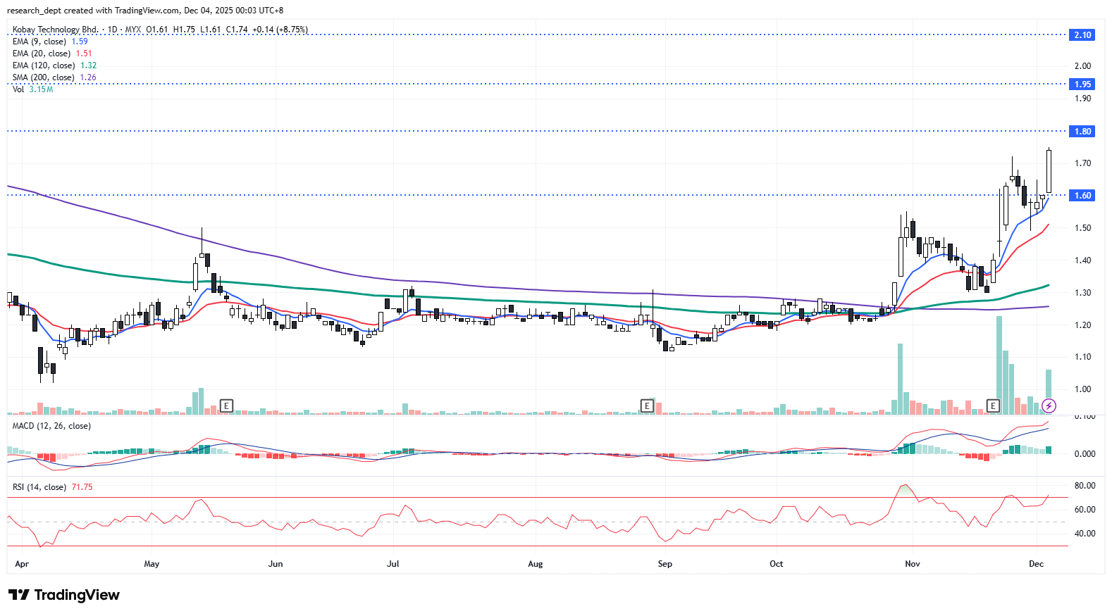The counter has been trending within an ascending setup with higher highs and higher lows since November. The recent pick up in volume, coupled with emerging signals from the MACD and RSI, reflect healthy trend continuation. A breakout above RM1.80 would reaffirm its uptrend, paving the way toward the next resistance levels at RM1.95 and RM2.10. On the downside, RM1.60 serves as immediate support, coinciding with the 9-day EMA.
