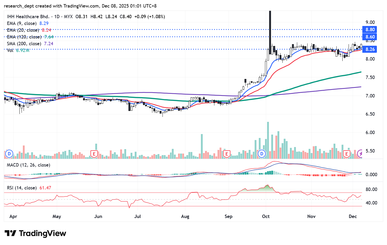 The stock was in a prolonged consolidation from April to early September with weak momentum, as prices stayed below key EMAs, before gaining traction and turning bullish in mid-September when it broke above the SMA120 and SMA200 on strong volume and a sharp rally. It is now consolidating at higher levels while maintaining a stable uptrend, which could pave the way toward the next resistances at RM8.60 and RM8.80, while immediate support stands at RM8.26.