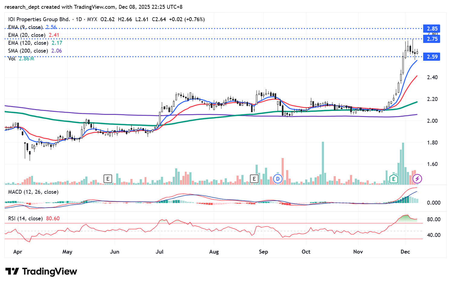The stock began an uptrend in July before moving sideways until November. Recently, it broke out above RM2.59 on a surge in volume before pulling back. It is now retesting support at RM2.59, indicating short-term profit taking. If the price holds above this level, it could pave the way for a continuation toward the next resistance levels at RM2.75 and RM2.85, with immediate support still anchored at RM2.59.