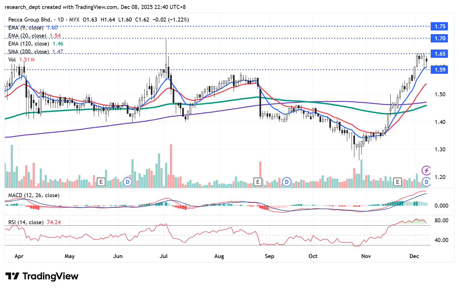 The stock had been consolidating for most of the year with choppy price action until October, after which it slipped into a brief downtrend in November and traded below the EMA120 and SMA200. By mid-November, it began recovering and shifted into an uptrend, with the price now hovering near RM1.65. A breakout above this level could pave the way toward the next resistance levels at RM1.70 and RM1.75, while immediate support is pegged at RM1.59.