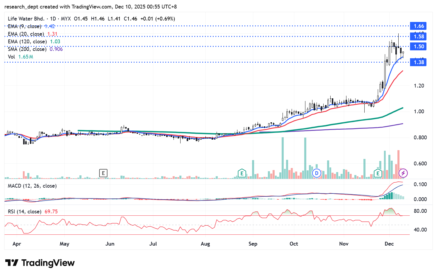 The counter was in prolonged consolidation before entering a gradual uptrend in September. Price surged in December, breaking above RM1.50, and has recently pulled back slightly on profit-taking. As long as the uptrend holds, it is likely to continue toward the next resistance levels at RM1.58 and RM1.66. On the downside, support is pegged at RM1.38.