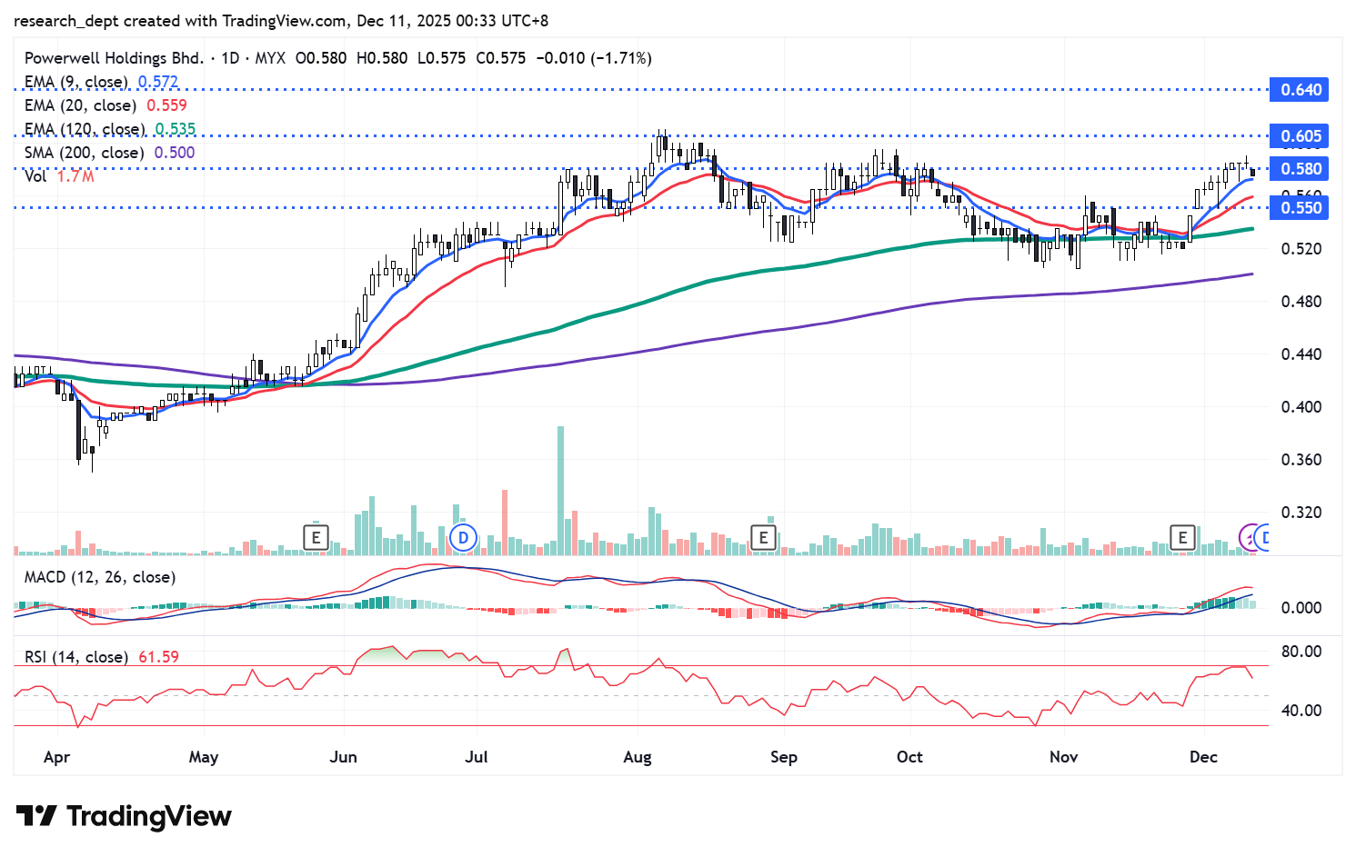 The stock began its uptrend in June after climbing above the EMA120 and SMA200. It consolidated in mid-July, where multiple attempts to clear the RM0.580 resistance were unsuccessful. A recent move above RM0.580 similarly failed to hold, resulting in a pullback. A firm breakout above RM0.580 could pave the way toward the next resistance levels at RM0.605 and RM0.640, while support remains at RM0.550.