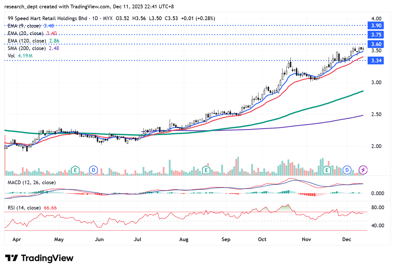 After consolidating for four months, the stock staged a clear uptrend in August, climbing steadily above the EMA120 and SMA200. The price has continued to advance and is now hovering just below its immediate resistance at RM3.60. Traders may monitor for a breakout above RM3.60, which could open the path toward the next resistance levels at RM3.75 and RM3.90. On the downside, support is located at RM3.34.
