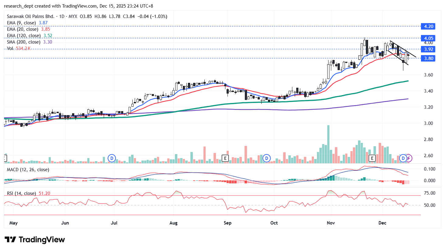 After a strong rally, the stock has entered a descending channel consolidation below the recent high at RM4.05. Price remains above its rising medium-term moving averages, indicating the broader uptrend is intact, but near-term momentum has moderated. A breakout above RM3.92 would signal trend resumption towards next resistance levels at RM4.05 and RM4.20, while RM3.80 marks near-term support.