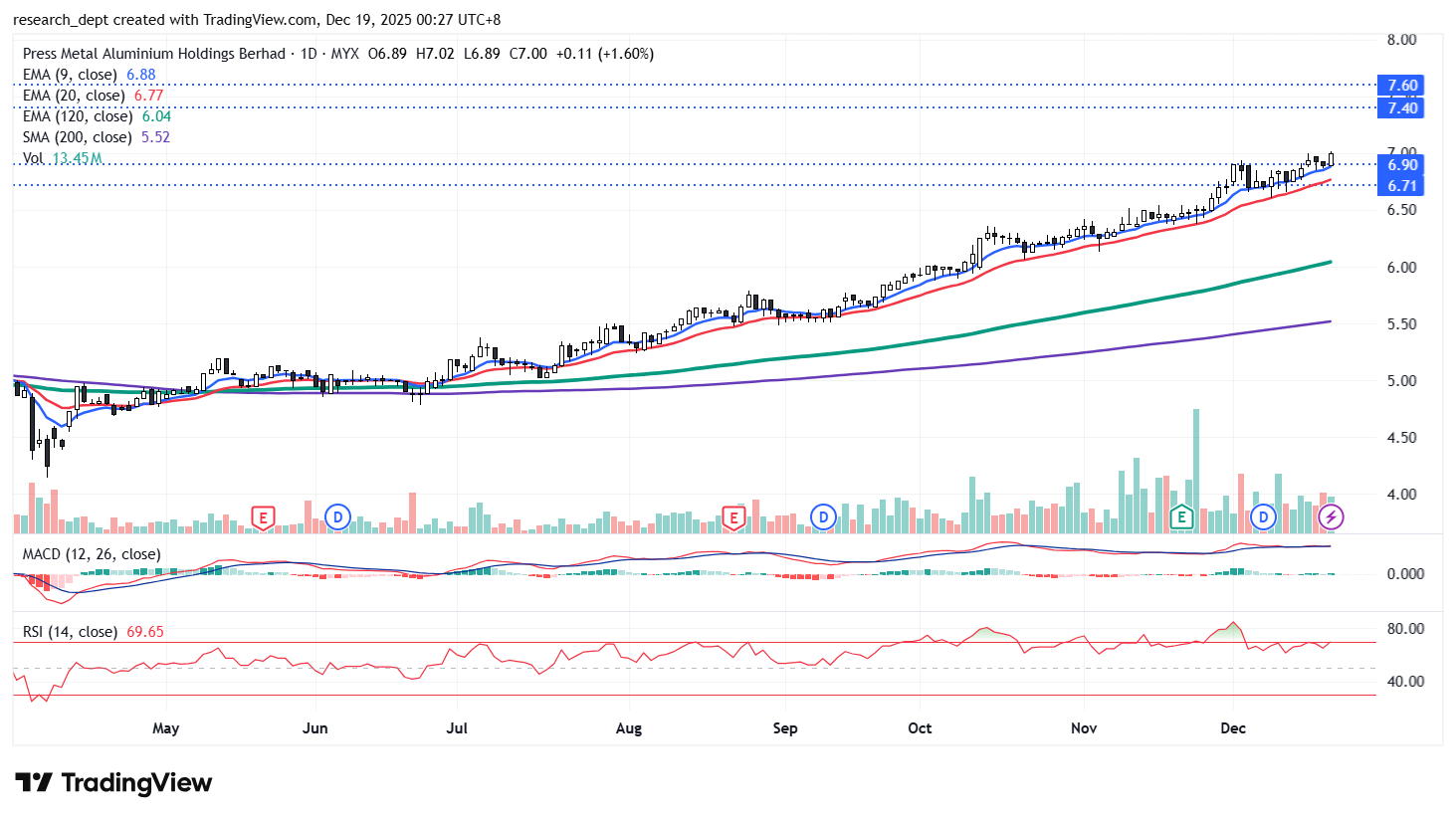 After a consolidation in May, the stock staged a strong rally and has since remained in an uptrend. The recent decisive breakout above the RM6.90 resistance confirms trend continuation, supported by firm volume and price holding above the short-term EMAs. Sustained strength above RM6.90 would open the path towards the next resistance levels at RM7.40 and RM7.60, while RM6.71 serves as the immediate support on any pullback.