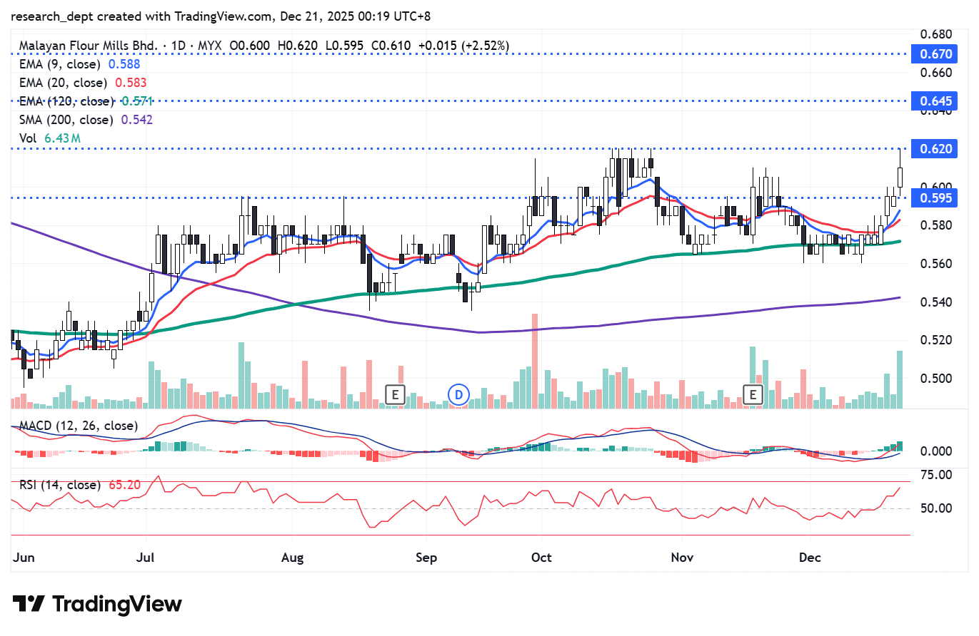 The stock is trading within a constructive uptrend, holding comfortably above its key moving averages. Momentum indicators are firm, with RSI trending higher and MACD turning positive. A sustained move above RM0.620 with strong volume would signal renewed upside momentum to advance toward the RM0.645- RM0.670 channel. On the downside, RM0.595 serves as an immediate support.