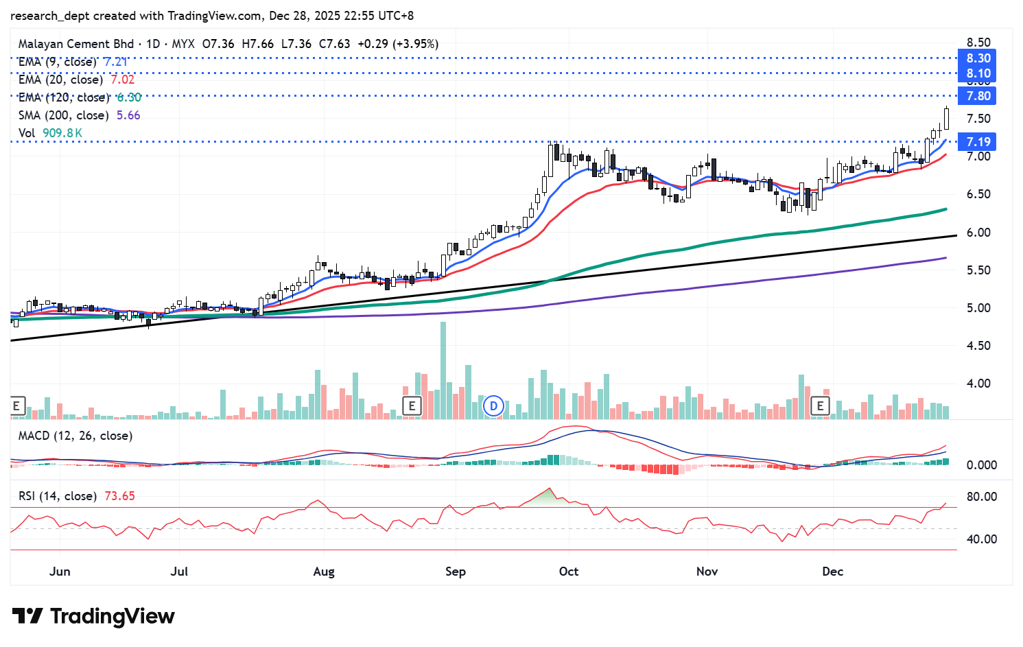 Following a prolonged sideways phase, the stock started to move higher in September. The advance accelerated in October before giving way to a brief consolidation. Recently, the uptrend has resumed, with a firm break above RM7.80 likely to confirm further upside. The next resistance levels are at RM8.10 and RM8.30, while support lies near RM7.19.