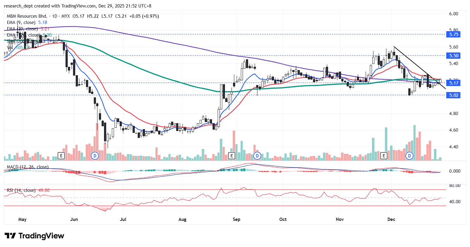 After correcting sharply in mid-year, the stock based out in late June before staging a recovery into August. Momentum subsequently paused, with price drifting into a descending consolidation pattern. More recently, the stock broke above the near-term down-trendline and RM5.17 resistance, signalling upside continuation toward the next resistance levels at RM5.50 and RM5.75. Immediate support sits at RM5.02.