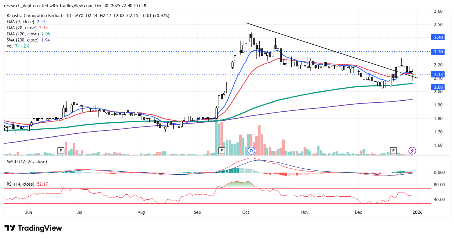 The stock consolidated between June and September before a sharp breakout drove a re-rating in late September. It has since undergone a healthy correction but continues to hold above key moving averages. A breakout–pullback–continuation pattern has now emerged above RM2.13, with the next resistance levels located at RM2.30 and RM2.40. Immediate support is positioned at RM2.03.