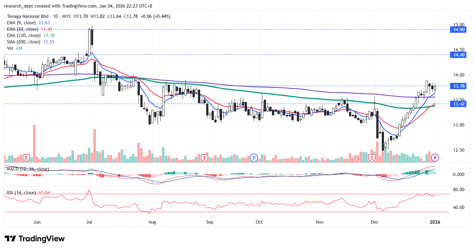 The stock peaked in July-25 and subsequently traded sideways for most of 2H25. Momentum then improved following a bullish reversal in mid-December, with the share price climbing back above the SMA200, signalling an uptrend bias. Currently, the stock is trading below the RM13.78 resistance level. A breakout above this level may pave the way toward the next resistance at RM14.40 and RM14.90. On the downside, RM13.42 serves as immediate support.