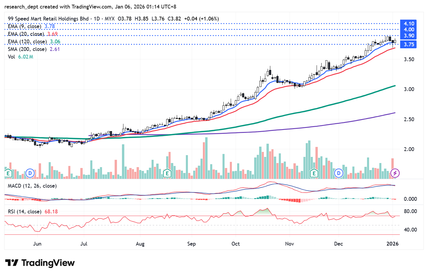 After a period of consolidation, the stock broke above the EMA 120 and SMA 200 in Aug-2025, signalling a clear shift into a steady uptrend. It is now testing resistance at RM3.90. A breakout above this level could pave the way toward the next resistance levels at RM4.00 and RM4.10. On the downside, support is located at RM3.75, which may cushion short-term pullbacks.