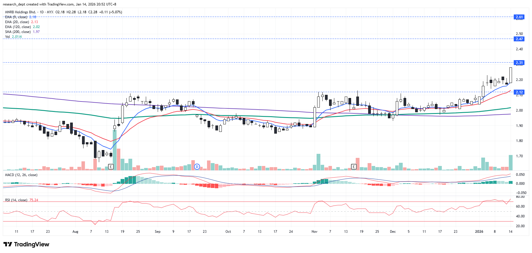 The stock has been trading in a muted sideway channel since November, largely tracking the movements of the short-term EMAs. Recent surge in volume and improving sentiment has enabled the stock to break above its previous resistance at RM2.12. The immediate focus is on the RM2.31 level, where a breakout could unlock further upside towards RM2.47 and RM2.61. On the downside, RM2.12 has turned into the immediate support level.