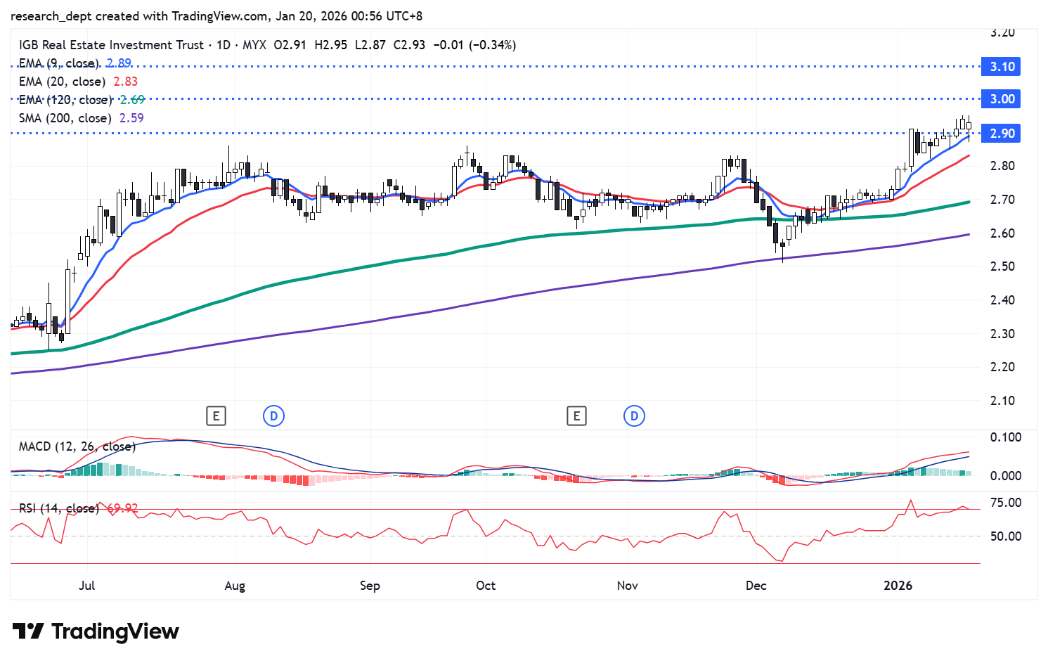 After trading in a range until Jul- 2025, the stock gradually turned higher as buying interest emerged, confirming a recovery in trend. The uptrend paused in Aug and moved into a consolidation phase before regaining momentum. In recent sessions, price pushed higher and formed a new high at RM2.94. If buying strength sustains, the stock may attempt a breakout toward the next resistance levels at RM3.00 and RM3.10. On the downside, immediate support is seen around RM2.90.