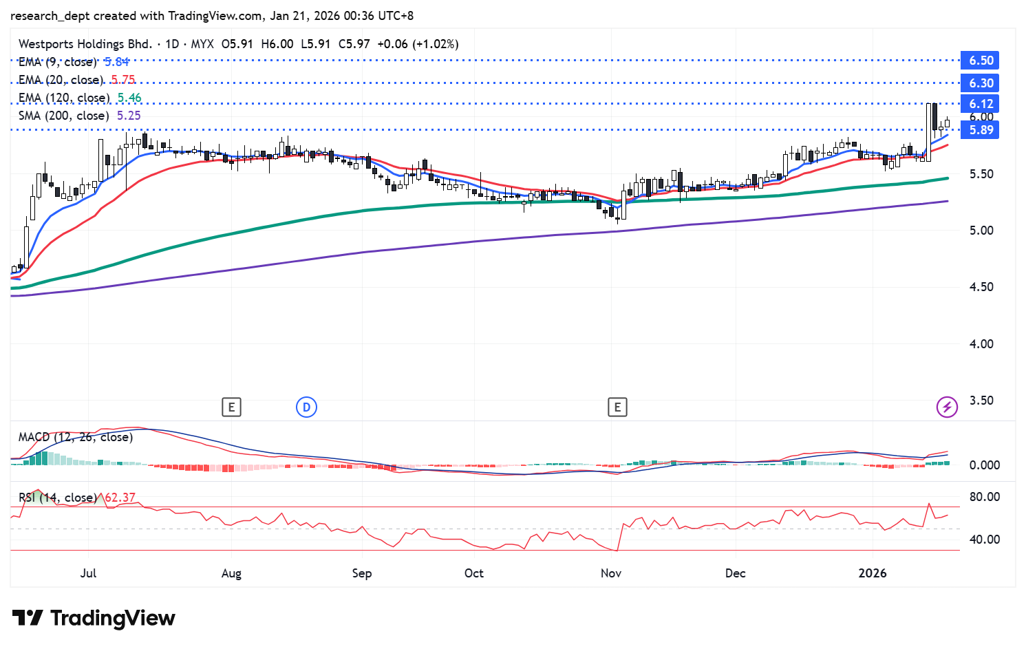 The stock rebounded in early 2H25 and entered a consolidation phase until January. Recently, momentum picked up, driving the price to a new high at RM6.12 before a mild pullback emerged. Despite the retracement, the price remains above its key moving averages, suggesting the broader uptrend is intact. A sustained move above RM6.12 could pave the way toward the next resistance levels at RM6.30 and RM6.50, while nearterm support is seen around RM5.89.