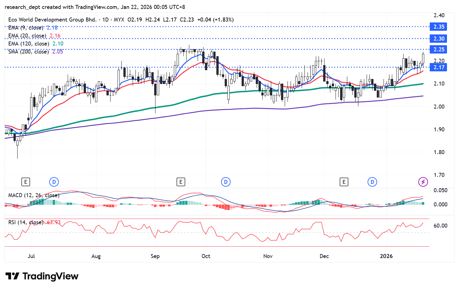 The stock dipped near RM1.85 in mid-25 before staging a steady rebound, forming higher lows and reclaiming key moving averages. Momentum then paused as it entered a consolidation phase marked by choppy price action. Recently, buying interest has resurfaced with the stock trading above its key moving averages. A decisive breakout above RM2.25 could pave the way towards the next resistance levels at RM2.30 and RM2.35, while on the downside, support is pegged at RM2.17.