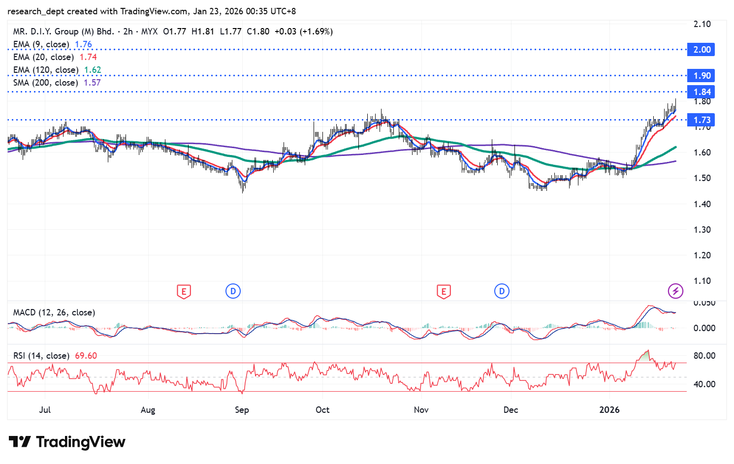 After a prolonged period of consolidation with limited momentum near its moving averages, the stock has gradually recovered as buying interest returned, pushing decisively above key moving averages. It is now trading above all major moving averages and testing the RM1.84 resistance. A breakout above this level could open the way toward the next resistance levels at RM1.90 and RM2.00, while immediate support is pegged at RM1.73.