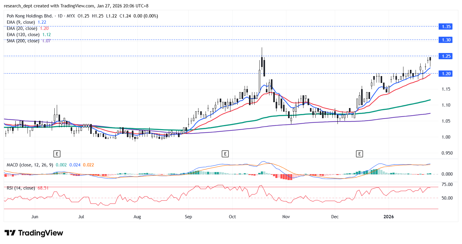 The stock consolidated through 2HFY25 before gaining traction in September. After peaking in late October, it underwent a healthy pullback to form a double bottom and has since resumed its rally. Traders may monitor for a breakout above RM1.25 to re-open upside toward the next resistance at RM1.30 and RM1.35, with immediate support at RM1.20.