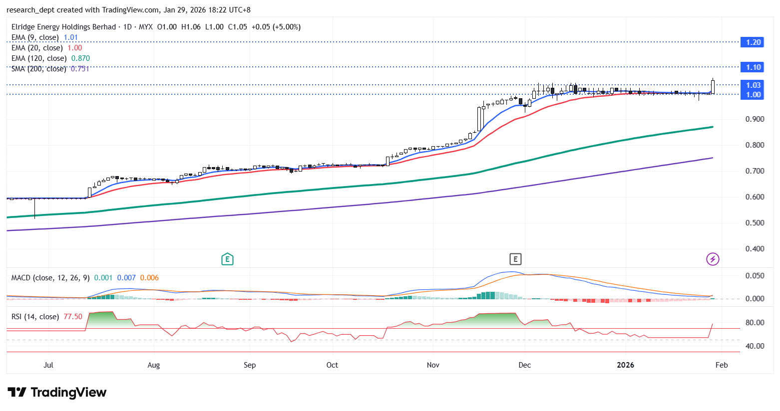 The stock rally before entering a consolidation phase in late October. The broader uptrend remains intact, with prices holding firmly above all key moving averages. A subsequent consolidation resolved with a decisive breakout above RM1.03, signalling a clear improvement in market sentiment. This opens upside potential toward the next resistance zone at RM1.10 and RM1.20, while immediate support is pegged at RM1.00.