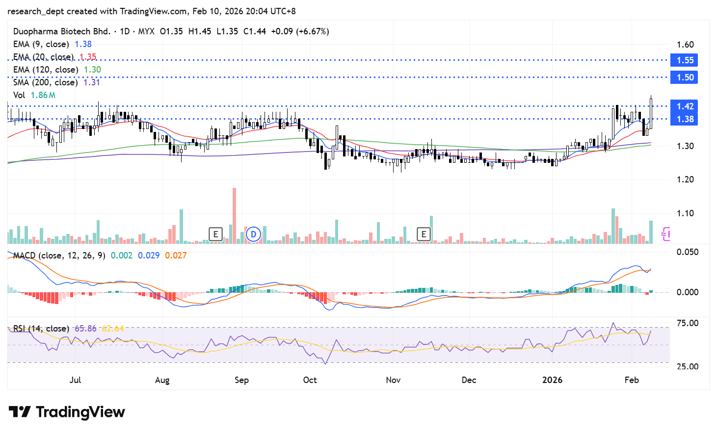 The stock has been in a prolonged consolidation phase throughout the second half of 2025. Recently, the stock gained momentum and broke out decisively after mid-January, pushing above all major moving averages. The recent breakout above the previous resistance at RM1.42 signals further upside potential, with the next resistance levels at RM1.50 and RM1.55. On the downside, support is pegged at RM1.38.