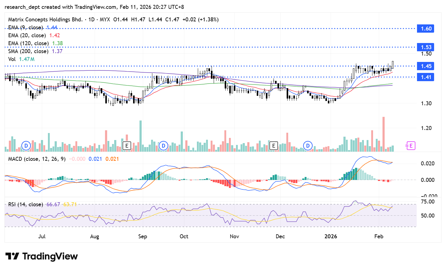 The stock has been in a prolonged consolidation phase throughout the second half of 2025. It recovered from its recent lows in January and gained upward momentum, pushing above all major moving averages. The recent breakout above the previous resistance at RM1.45 signals further upside potential, with the next resistance levels at RM1.53 and RM1.60. On the downside, support is pegged at RM1.41.