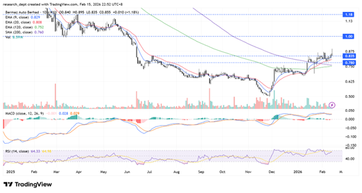 Following a downtrend that ended in December, price has been on an uptrend since the start of 2026 before consolidating around the high of RM0.835 with support pegged at the close of RM 0.78. An uptrend continuation could lead into a test of the support-turned-resistance at RM 1.00. Traders may monitor a breakout above this level with the next resistance at RM 1.18. Should bias turn neutral, a new price range bounded by RM1.00 and RM1.18 could occur.