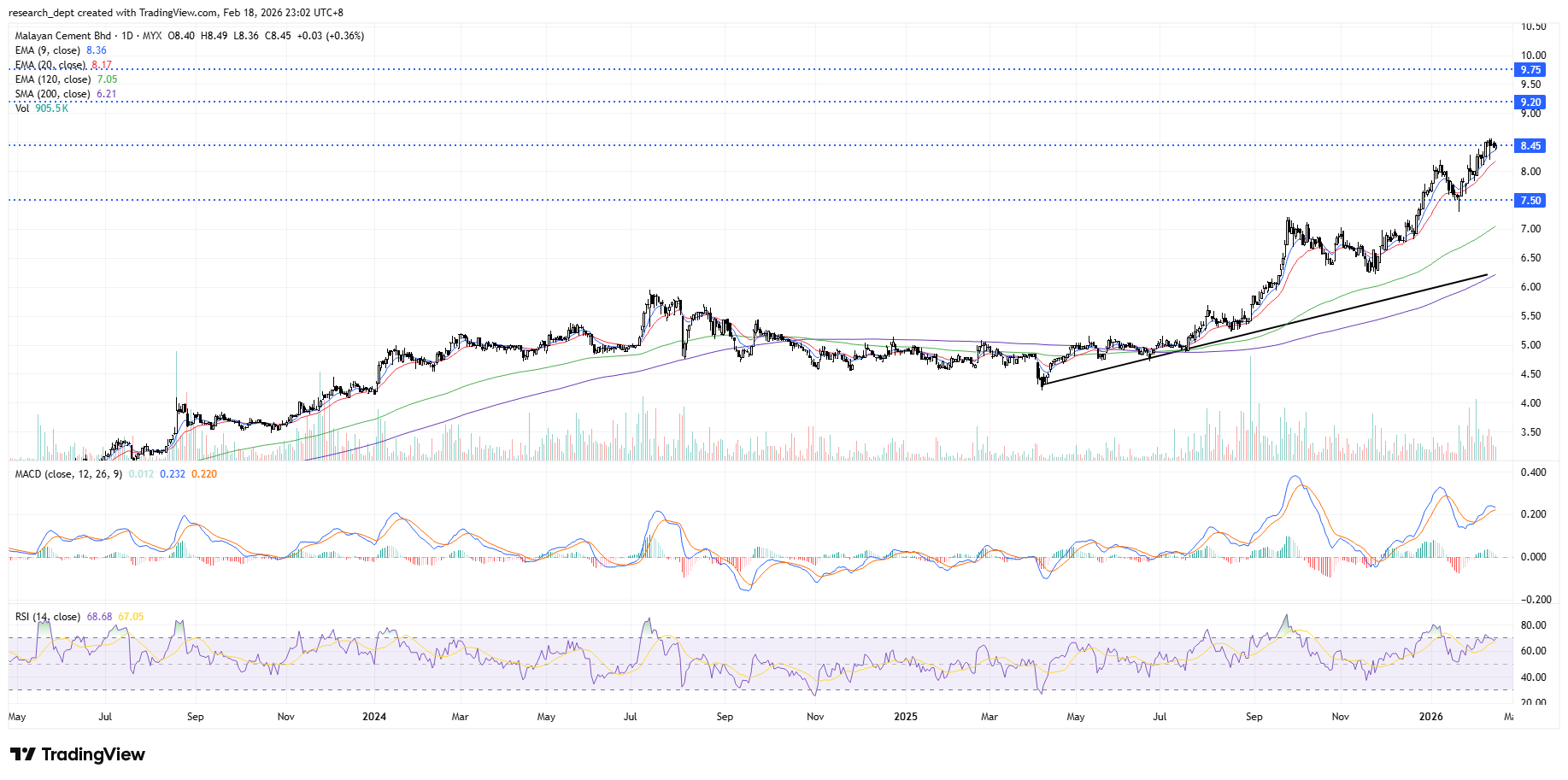 With an uptrend present, traders could observe a pullback to support at RM 7.50 for an entry into the trend. A continuation from support could lead to a test of the resistance at RM 9.20 and should a price breakout occur, traders could observe the potential for a test of the RM 9.75 level.