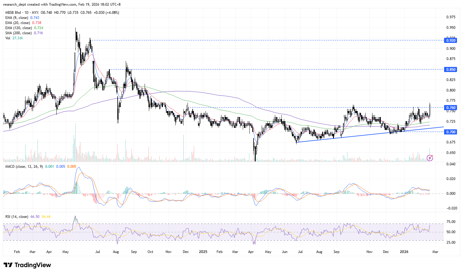 With the recent breakout above the RM0.76 resistance level, traders could monitor the potential for an uptrend towards the next resistance at RM0.85. A repeated show of strength could lead to more upside towards the final resistance at RM0.92. For the downside, support is pegged at RM0.70 on an upward sloping trendline.