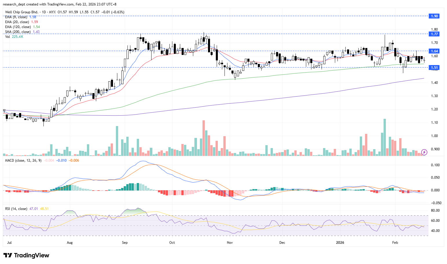The stock has been trading sideways since Nov 2025 while maintaining a strong support near the EMA120. A decisive move above RM1.64 could unlock potential for further upside, with the next resistance zone seen at RM1.77, followed up by RM1.90. On the downside, RM1.51 remains the key support level.