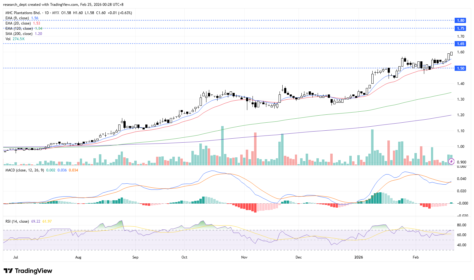 The stock continues to trend higher, sustaining its momentum above the EMA9 with consistent buying interest. Price action reflects healthy trend continuation, supported by a rising MACD histogram and RSI in bullish territory. A breakout above RM1.65 would reinforce the uptrend, with next resistances at RM1.75 and RM1.80, while RM1.50 remains the immediate support.