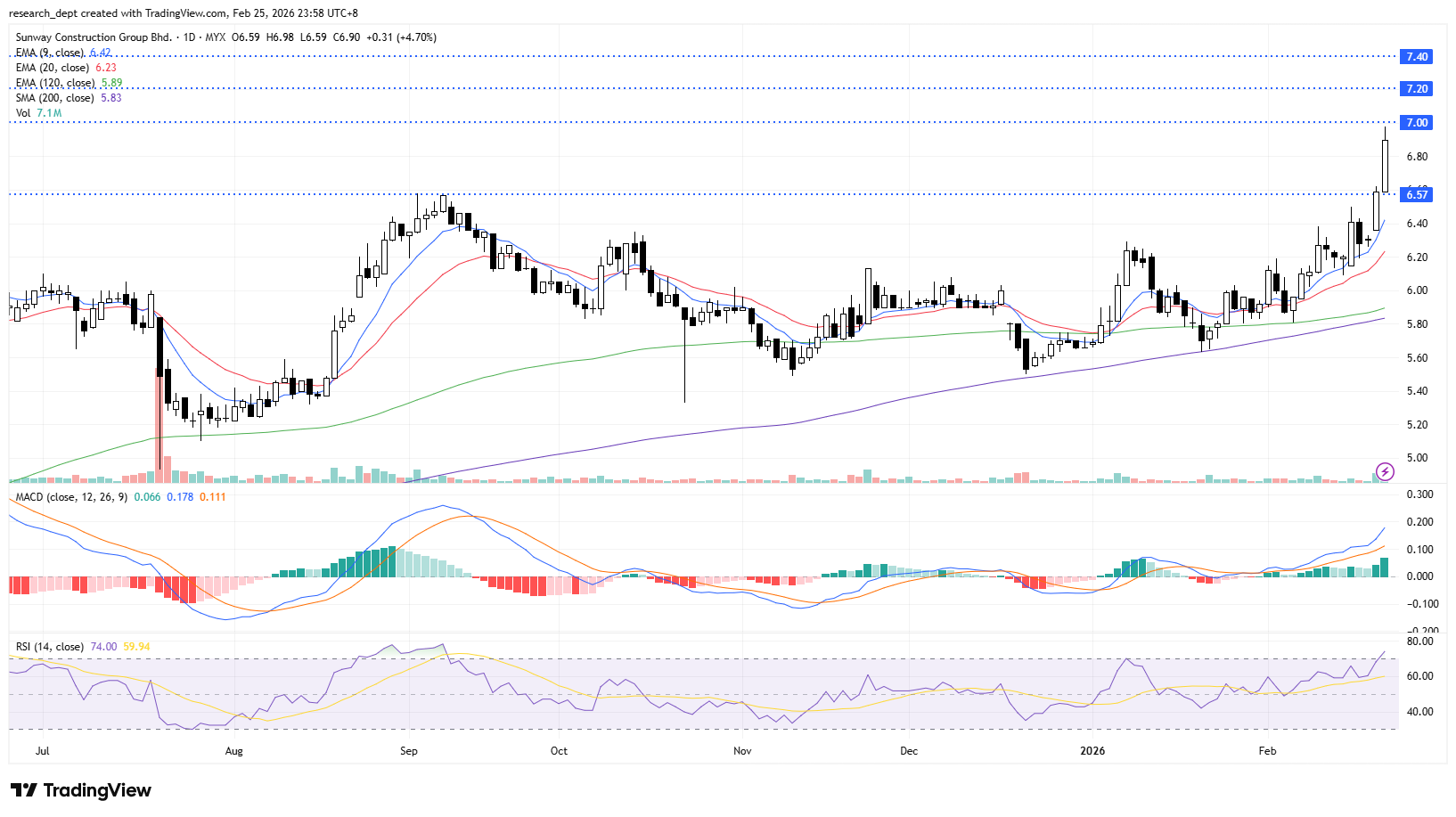 The stock has staged a sharp uptrend since February, reclaiming key moving averages and confirming a trend reversal. Following the strong rally, prices are consolidating near the upper band of the recent range. A breakout above RM7.00 would reinforce a bullish bias and open the path toward the next resistance at RM7.20-RM7.40. On the downside, immediate support is anchored at RM6.57.