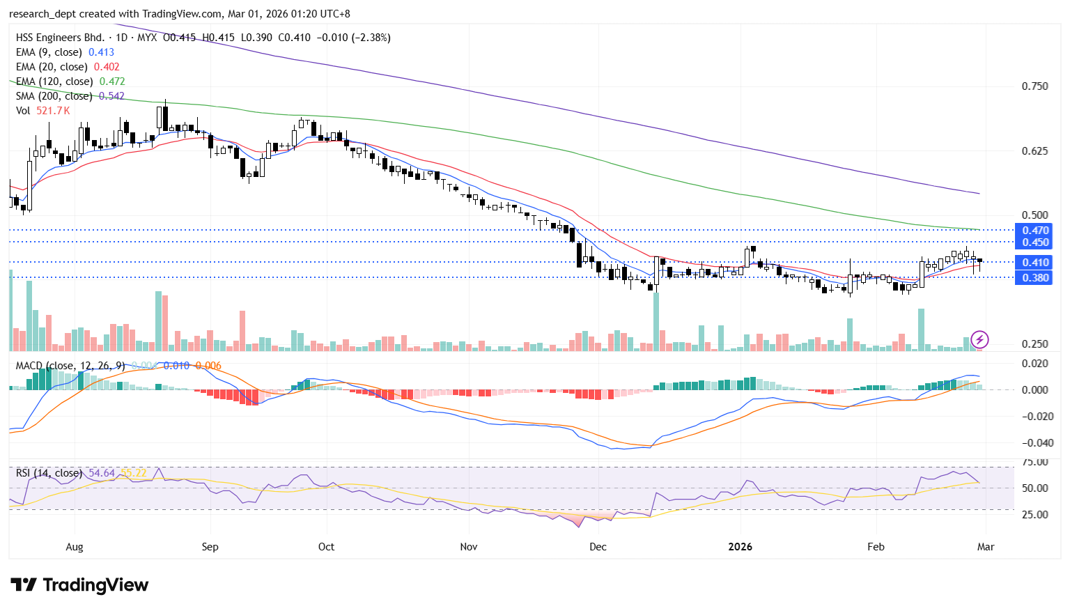 After peaking in August, the stock entered a corrective phase before bottoming at RM0.35. It has since traded within a narrow range over the past three months, with momentum indicators remaining constructive. A breakout above the RM0.41 resistance level would confirm renewed bullish momentum, paving the way towards RM0.45 and RM0.47. On the downside, immediate support is seen at RM0.38.