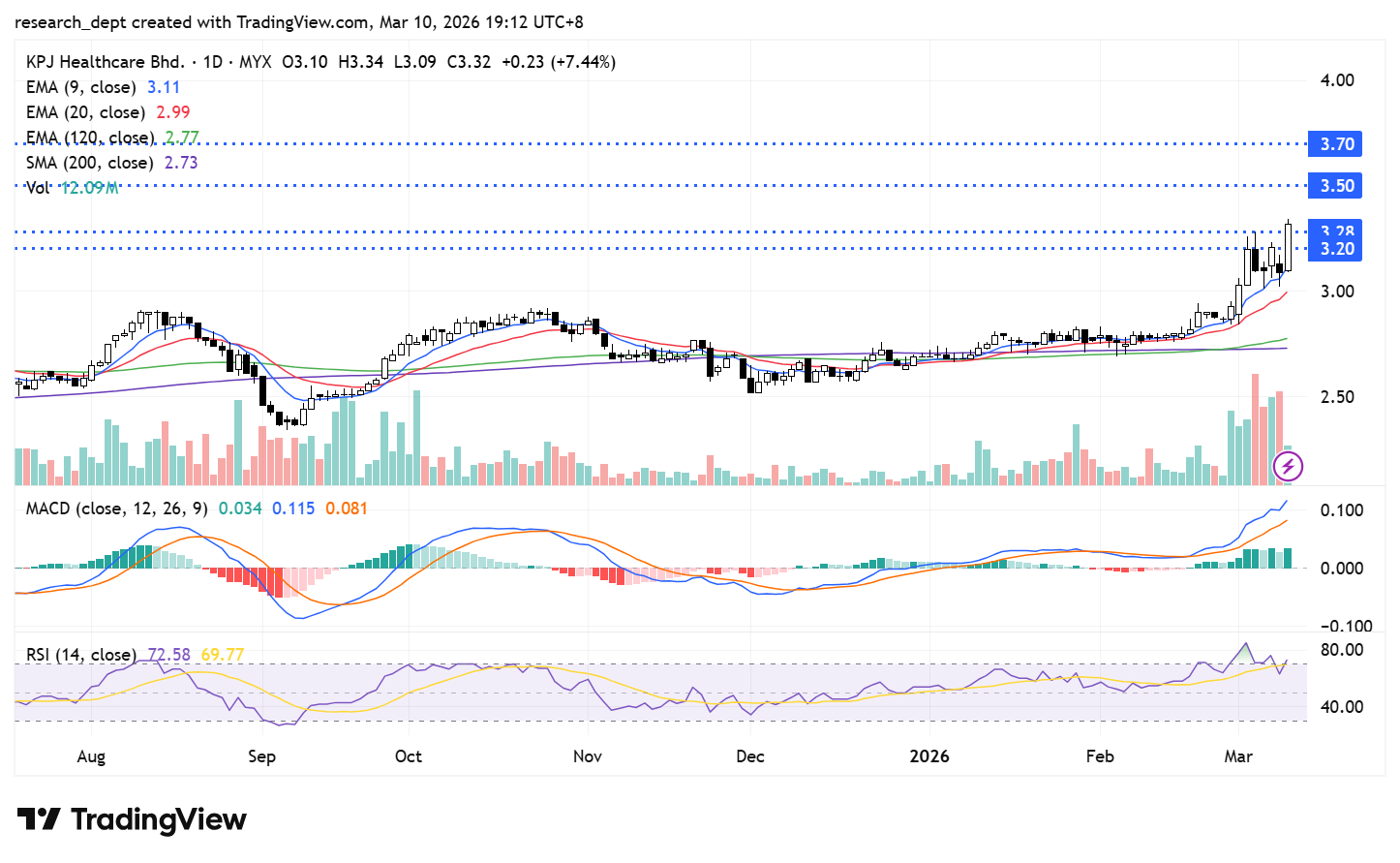 The stock has been range-bound since August but has recently staged a constructive move in March, supported by a surge in buying volume and improving momentum indicators. The breakout above the previous peak at RM3.28 suggests further upside potential, with the next resistance levels at RM3.50 and RM3.70. On the downside, support is pegged at RM3.20.