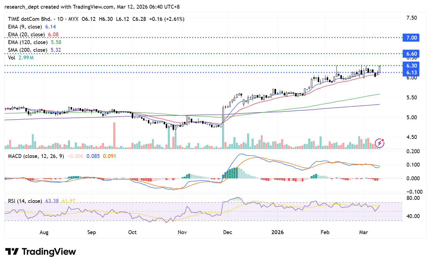 The stock has maintained a steady uptrend since early December, supported by price action above its major moving averages. Momentum strengthened in February, suggesting further upside potential towards RM6.60 and RM7.00, while RM6.13 acts as immediate support