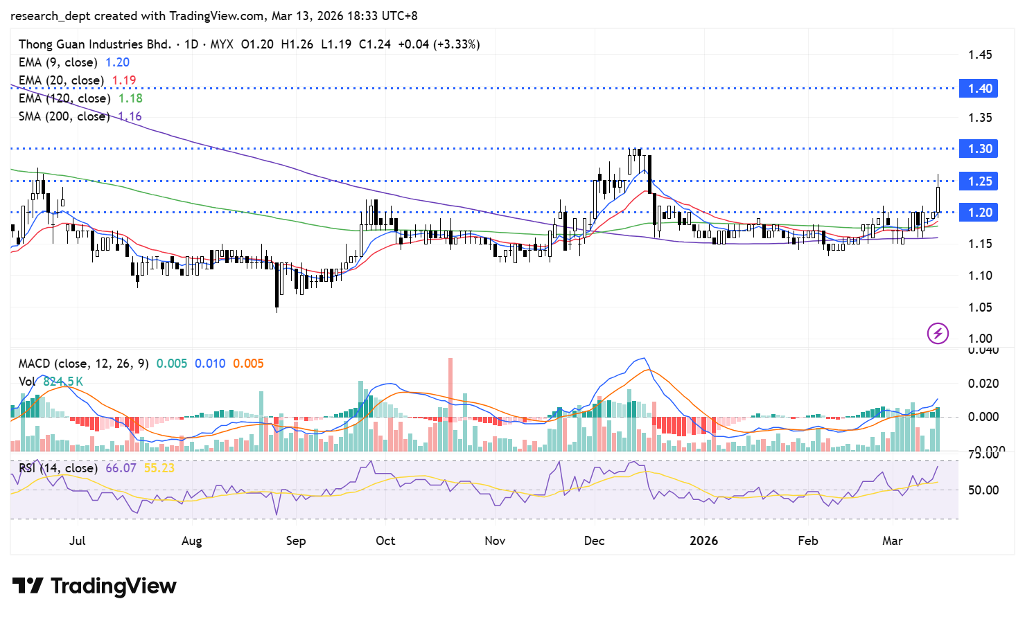 The stock has been largely range-bound, trading within a sideways consolidation phase. Technical momentum strengthened significantly yesterday, with prices regaining upward traction and moving above all major moving averages. A breakout above RM1.30 could unlock further upside potential, paving the way towards the next resistance level at RM1.40. On the downside, RM1.20 serves as the immediate support level.