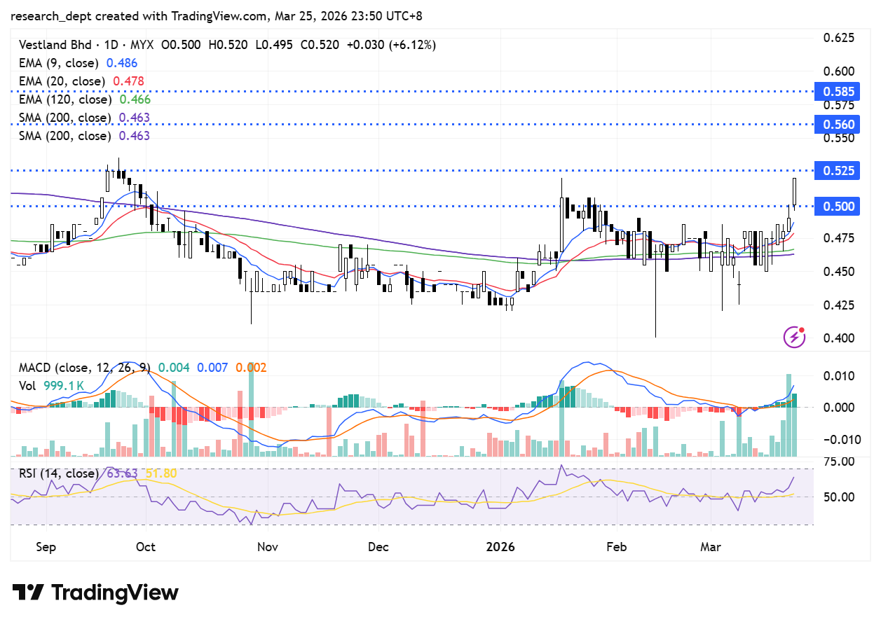 The stock has staged a constructive move, reclaiming all major moving averages. Improving indicators and renewed buying interest suggest a shift in near-term sentiment. A move above RM0.53 could open the way towards the next resistance levels at RM0.56 and RM0.585, while RM0.50 serves as immediate support.