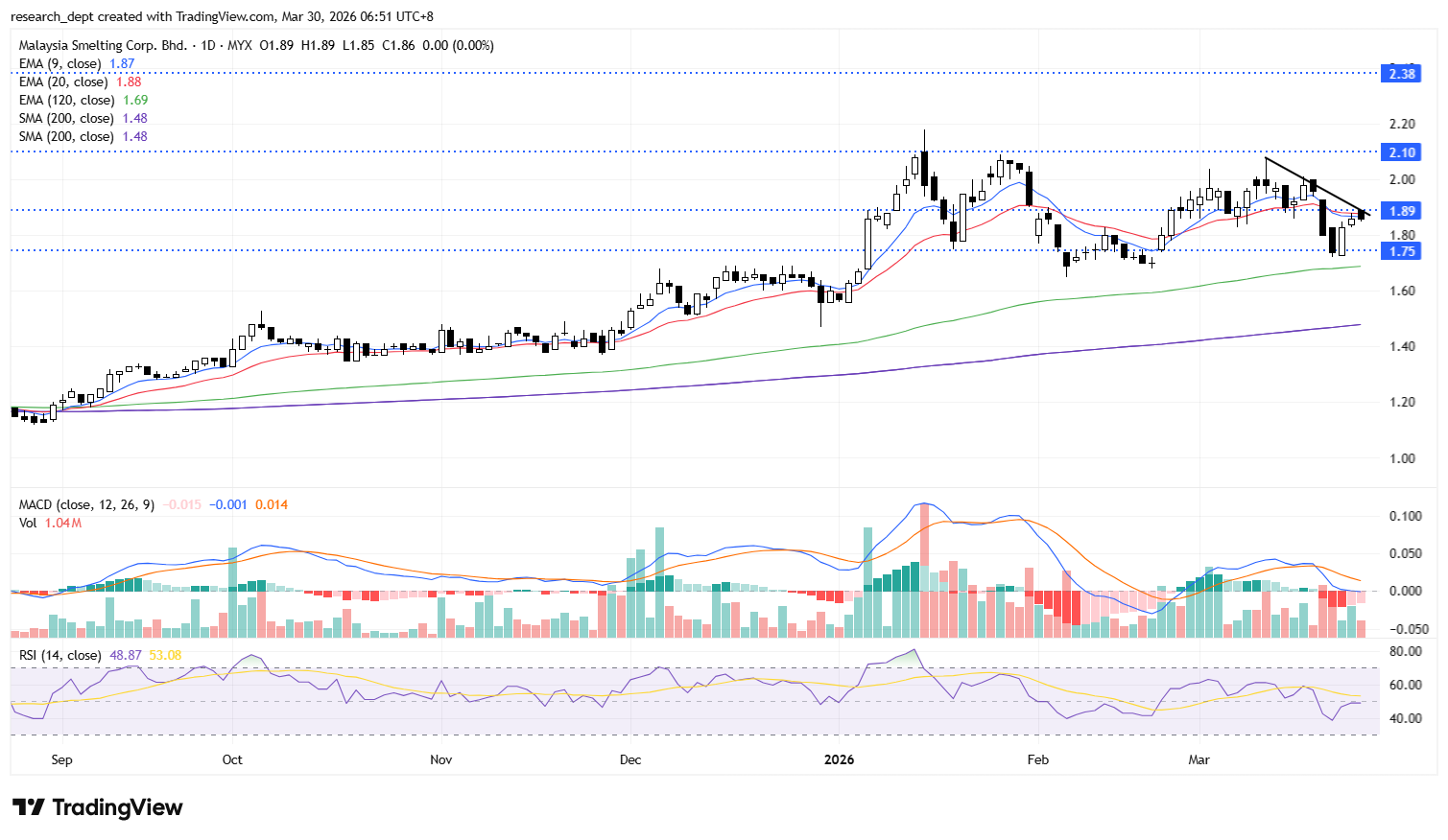 A breakout above RM2.10 could open the way towards RM2.38, while RM1.75 serves as support.