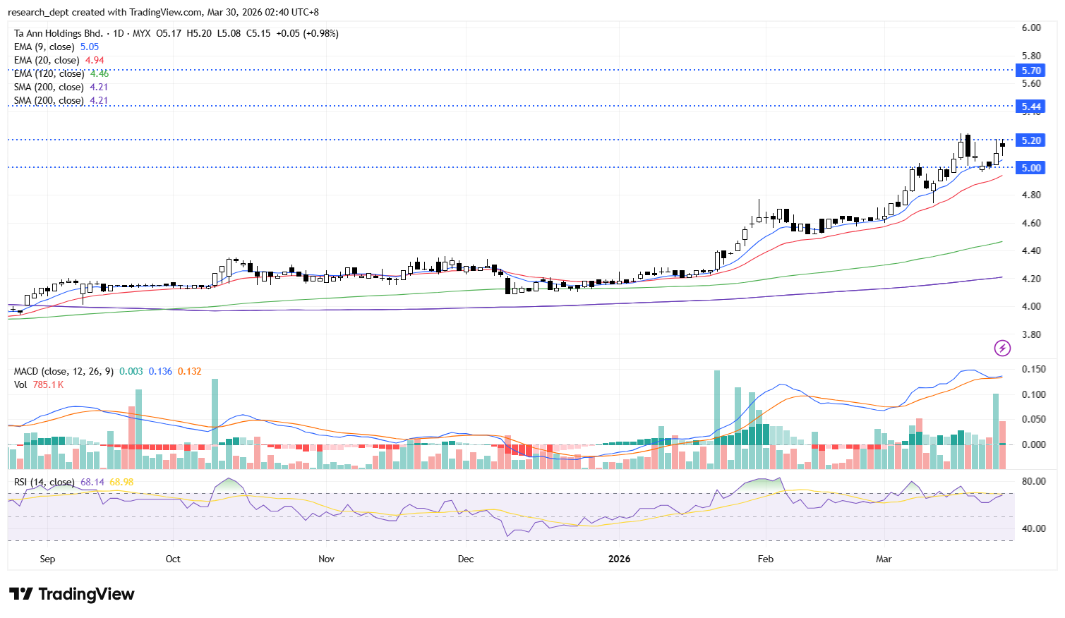 A breakout above RM5.24 could open the way towards RM5.44, with the next resistance at RM5.70, while RM5.00 serves as immediate support.
