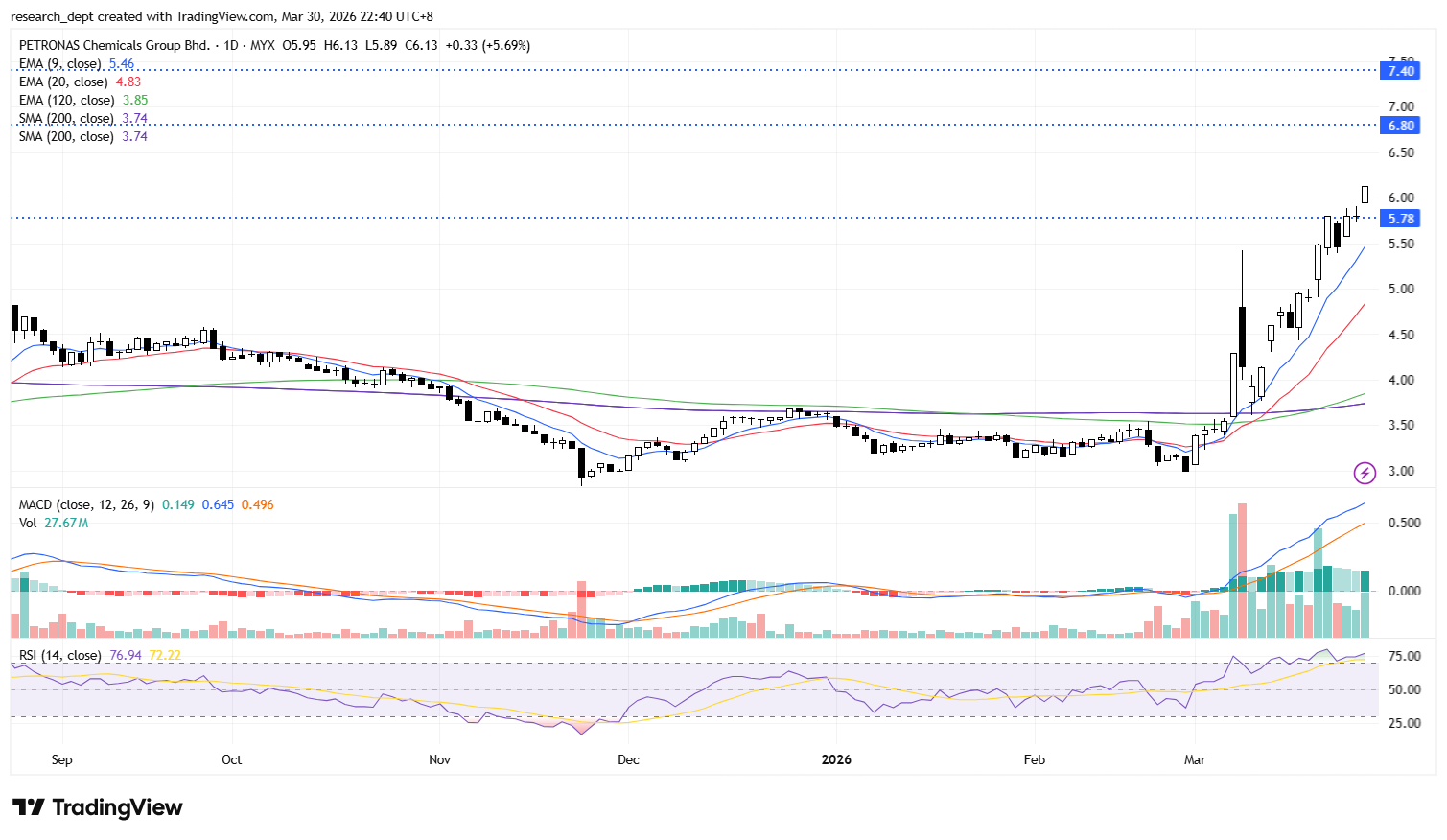 Further upside could see prices move towards RM6.80, followed by the next resistance at RM7.40, while RM5.78 serves as support.