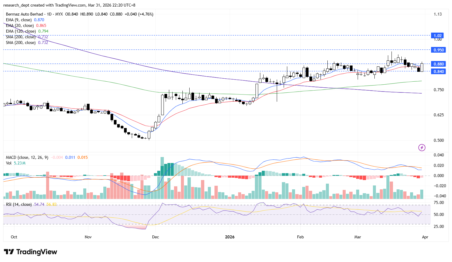 A breakout above RM0.95 could open the way towards RM1.02, while RM0.84 serves as support.