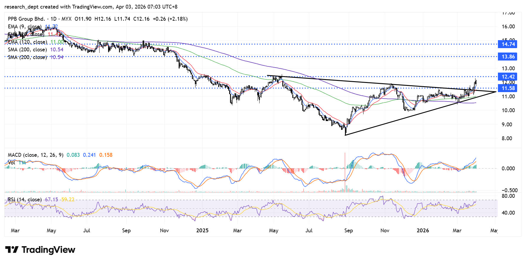 Prices may advance towards RM13.86, with the next resistance at RM14.74, while RM11.59 serves as support.