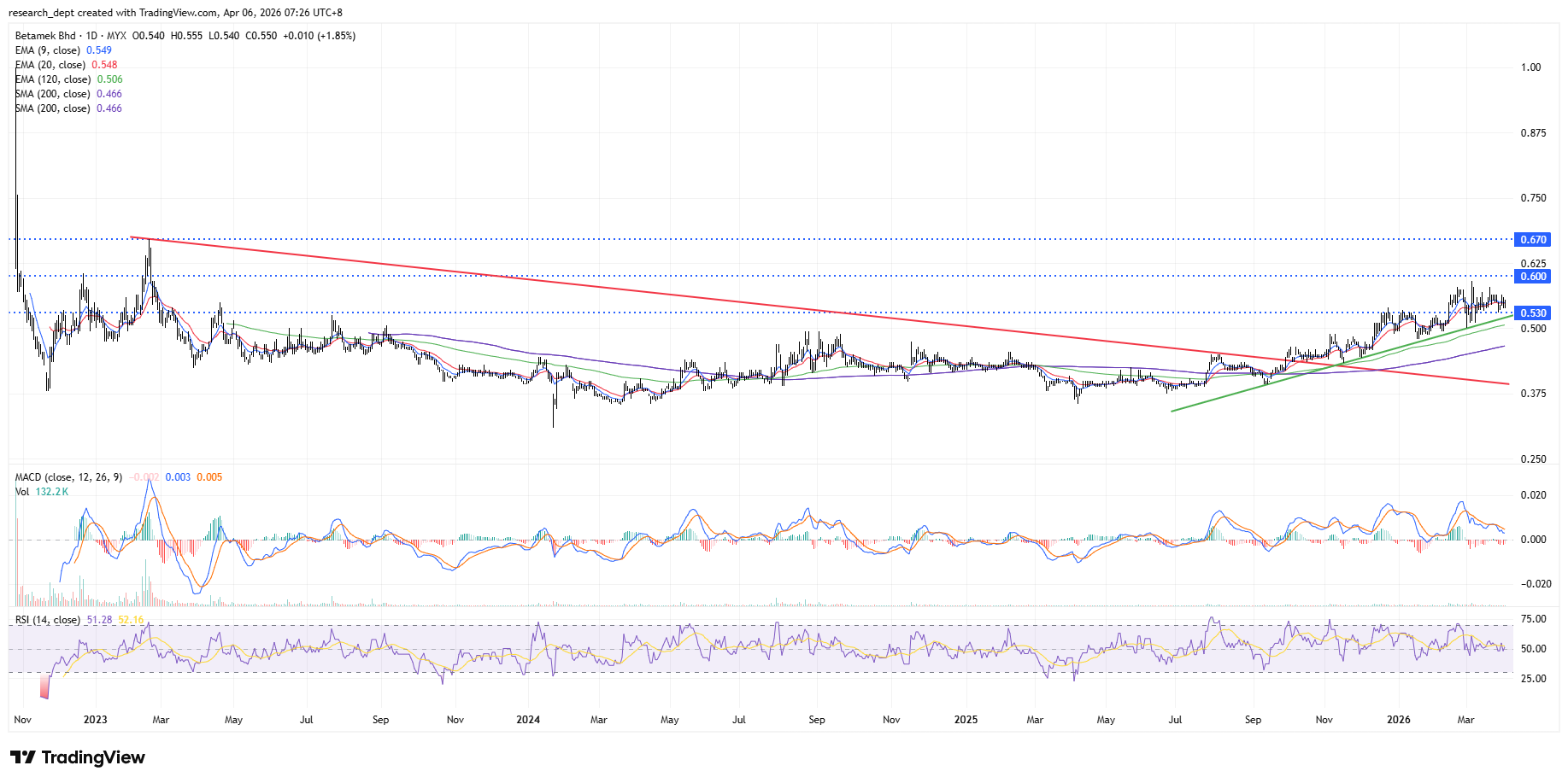 We recommend a Trading Buy, with RM0.60 as the first resistance, followed by RM0.67, while RM0.53 serves as near-term support.