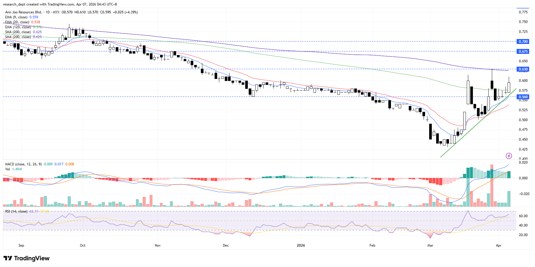A breakout above RM0.630 could open the way toward RM0.675 and RM0.700, while RM0.560 serves as the immediate support.