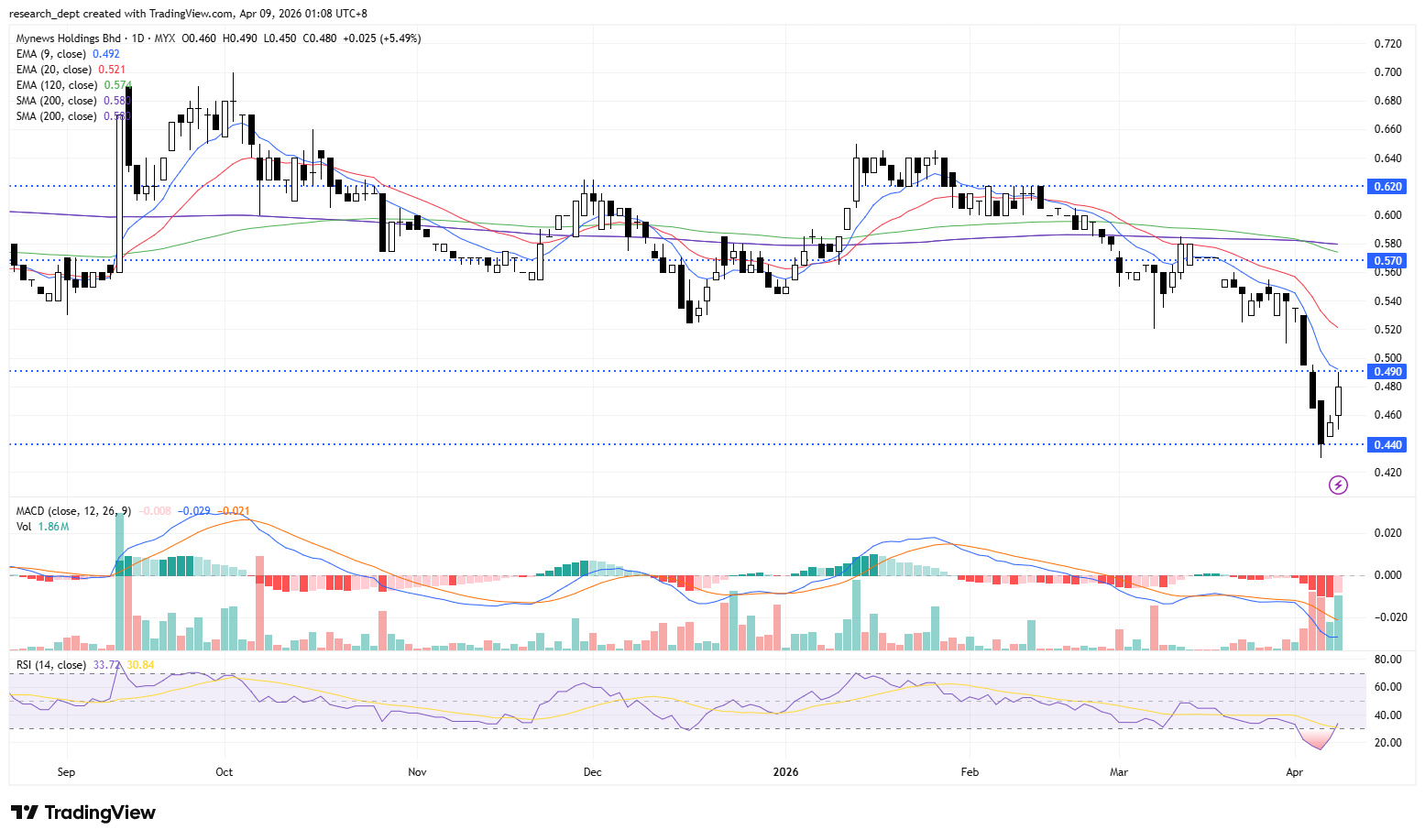 The immediate test lies at RM0.49, where a sustained move above this level could accelerate upside momentum towards the resistance zone at RM0.57-RM0.62. On the downside, RM0.44 remains the key near-term support.