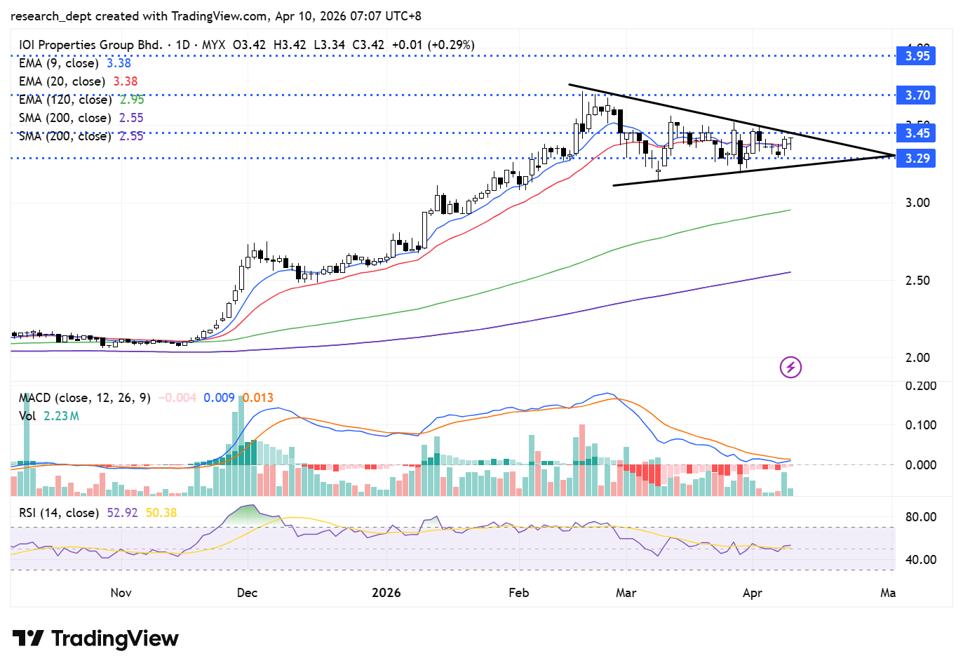 A decisive move above RM3.45, would indicate a bullish shift in momentum, with upside targets at RM3.70 and RM3.95. Immediate support is seen at RM3.29.