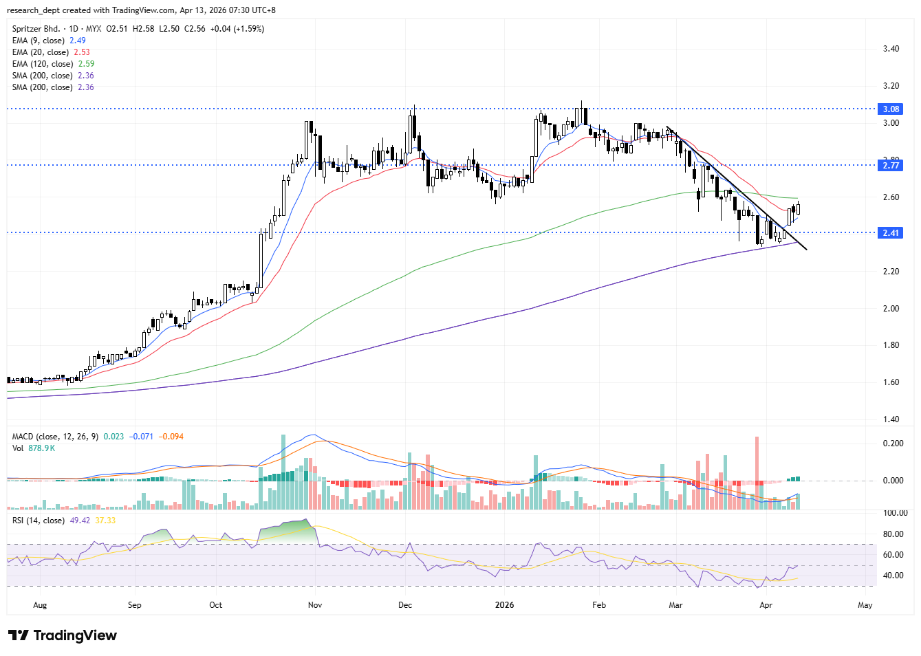 Resistance is seen at RM2.77, followed by RM3.08, while the stop-loss is set at RM2.41.